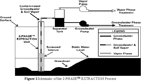To extract both groundwater and soil vapor from a single extraction well, the 2-PHASE EXTRACTION process uses a vacuum pump to apply a high vacuum (generally 18 to 29 inches of mercury) through a central extraction tube, which extends down the well. Soil vapor drawn into the well by the vacuum provides for a high velocity vapor stream at the bottom tip of the extraction tube, which entrains the contaminated groundwater and lifts it to ground surface. As groundwater moves through the extraction system, as much as 95 percent of the VOCs in the water phase are transferred to the vapor phase. The vapor and water phases are then separated at the surface in a separator tank. The water phase requires only carbon polishing prior to discharge, provided that the compounds are adsorbable. With some compounds the water carbon treatment can be eliminated. The vapor phase is subjected to carbon treatment, bioremediation, resin regeneration, catalytic oxidation, or other vapor phase treatment (based on contaminant characteristics, mass loadings, and economics) prior to release to atmosphere.